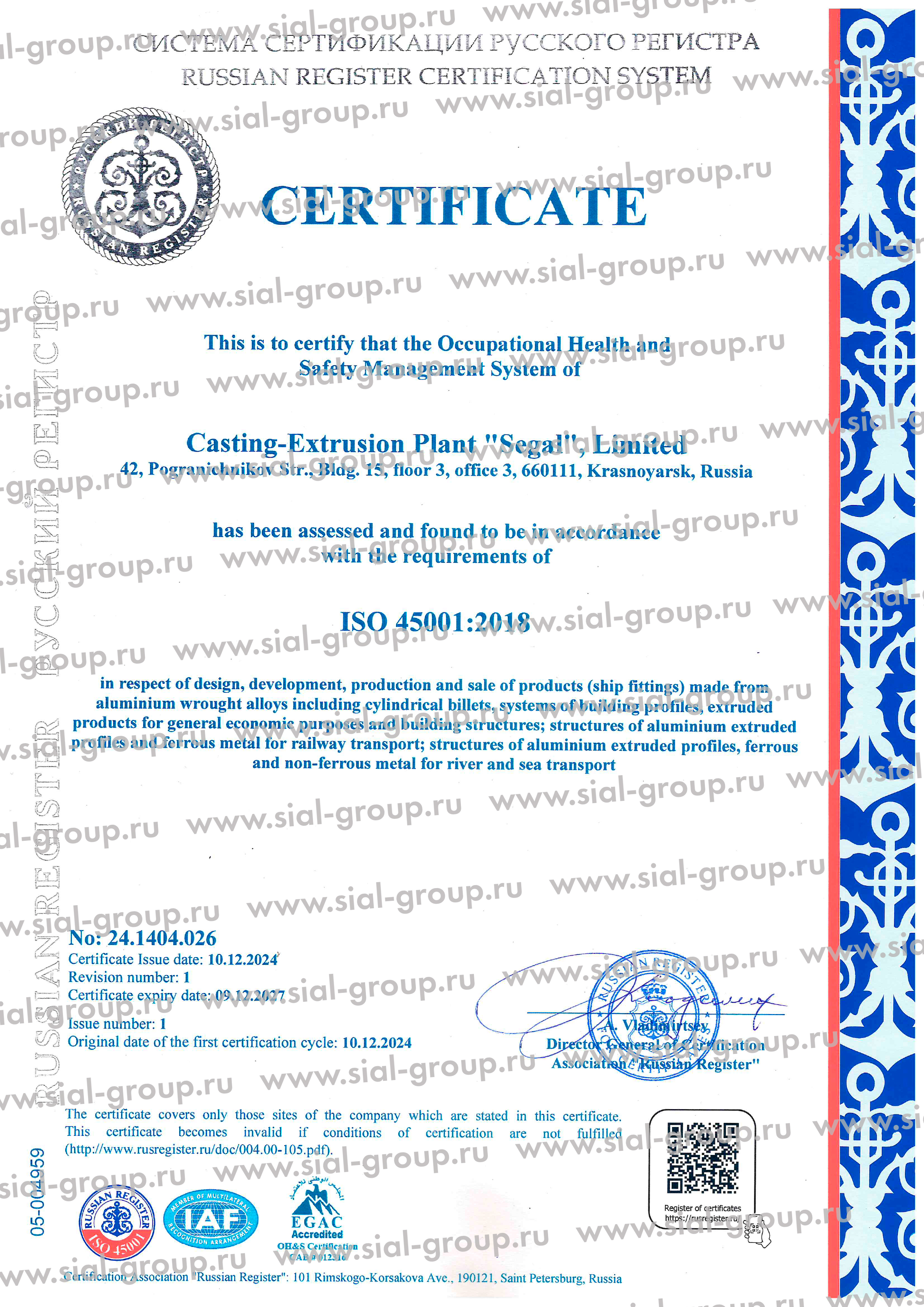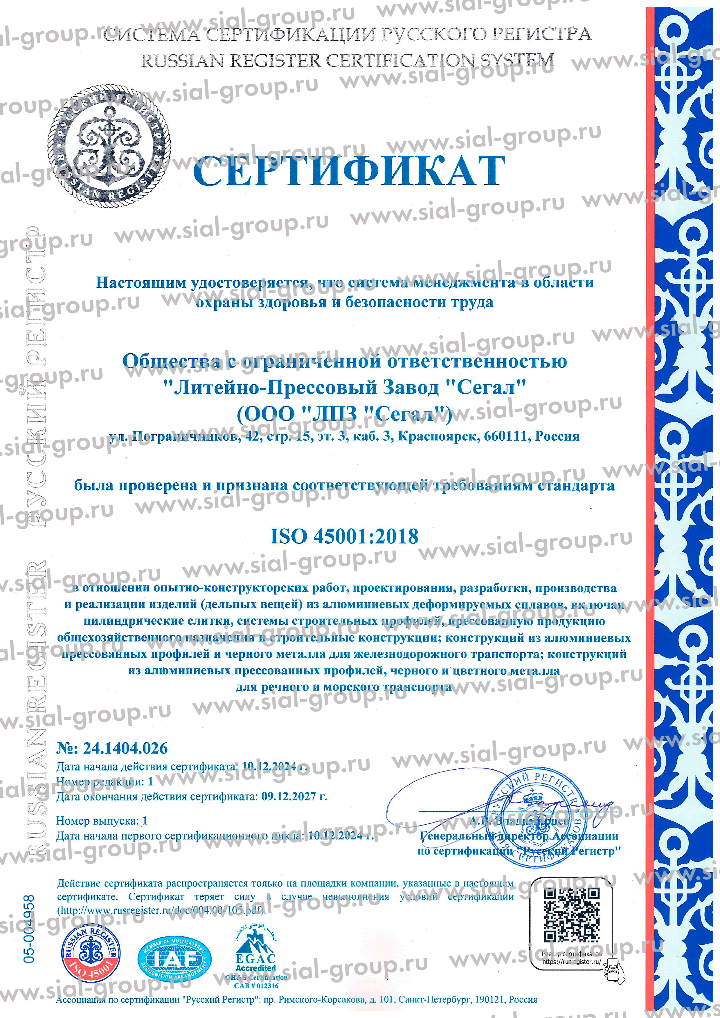 2024Сертификат соответствия системы менеджмента охраны труда ISO 45001:2018