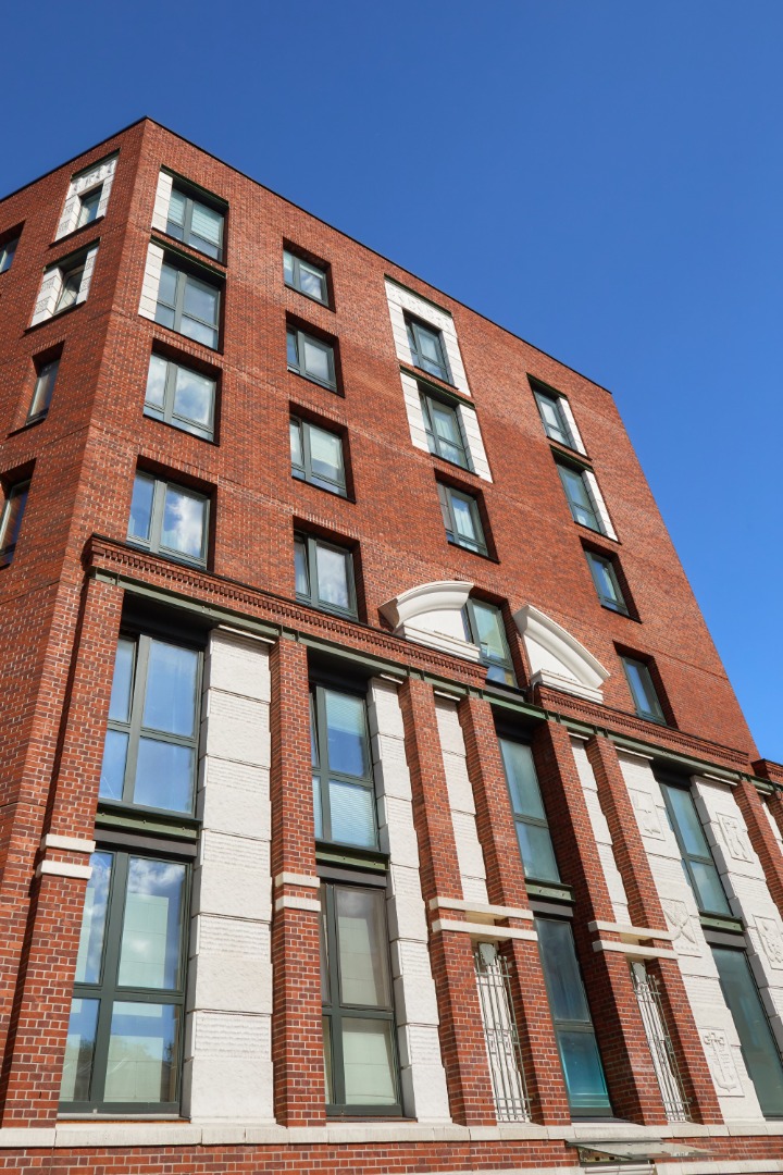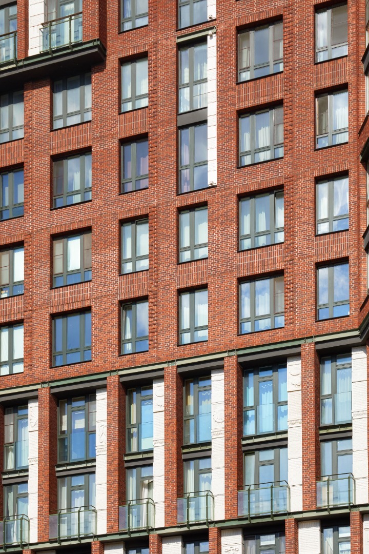 Проект отличается большими поверхностями остекления, сочетанием темного клинкерного кирпича, светлой и золотой штукатурки, рядом колонн, который обрамляет окна и оригинальными декоративными панно на простенках.
